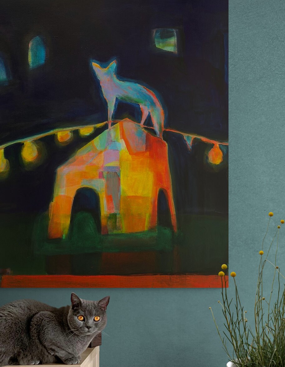 Luminous, colour forward Fauvist symbolic- abstract painting on stretched canvas. A larger scale work at 100cm square. Deep blue background evoking a dreamlike and mysterious scene of a fox on a house with lights illuminating the darkness around the shapes and scene.